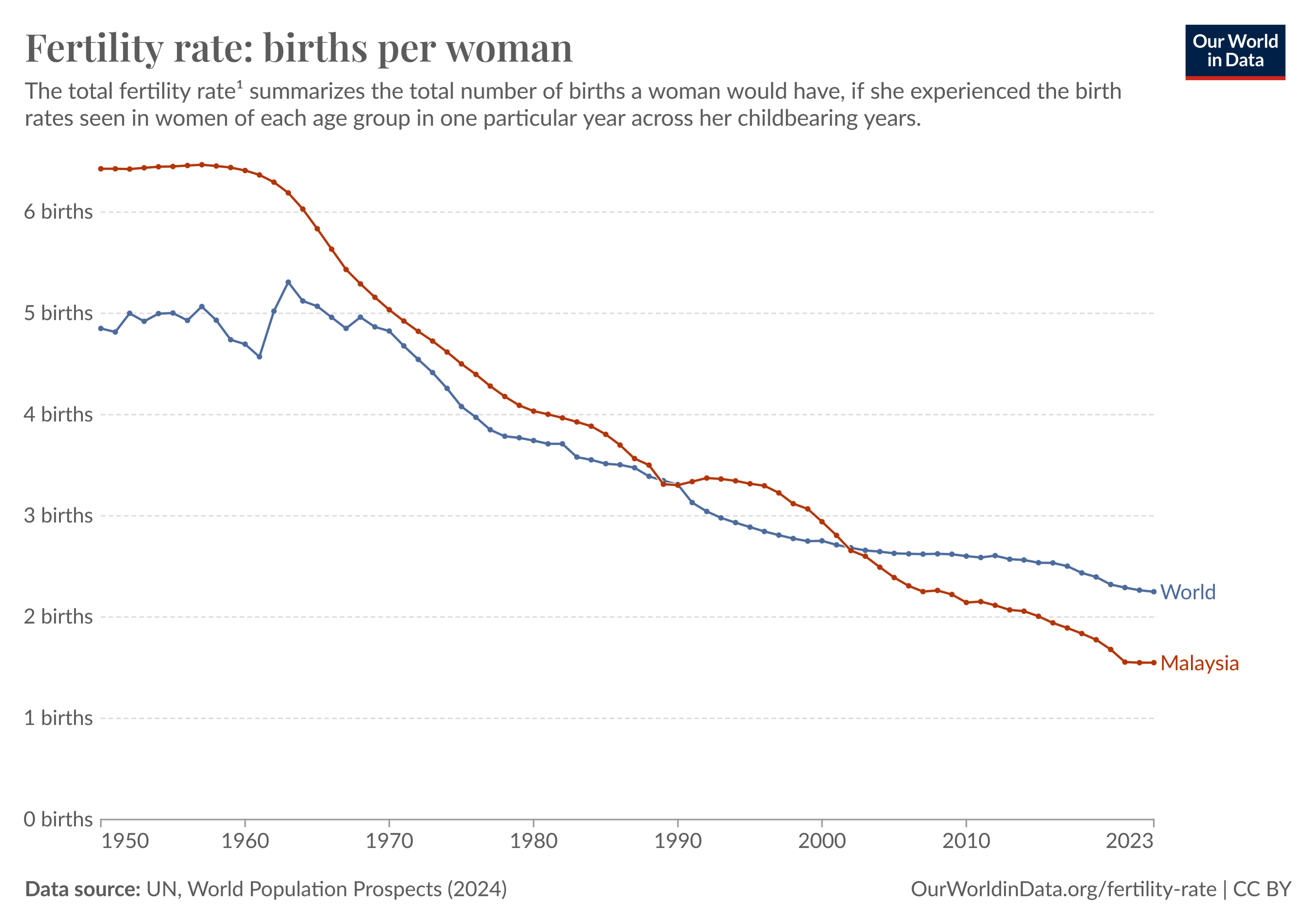 In Malaysia, the fertility rate has fallen from 6.41 births per woman in 1960 to just 1.79 in 2022